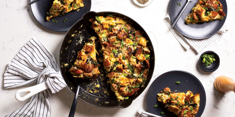 Arrange ½ the bread cubes in prepared skillet or baking dish. Cover with ½ the sausage, kale and onion mixture, then top with ⅓ the grated cheddar and ⅓ the green onions. Repeat the process with remaining bread and sausage mixture, followed by another ⅓ the cheese and ⅓ the green onions. Pour egg mixture over the top. Use a spatula to press ingredients down and encourage bread to soak up egg mixture. Sprinkle with remaining cheese. Allow to sit on the counter at room temperature for at least 30 minutes, or cover and refrigerate for an hour to overnight.