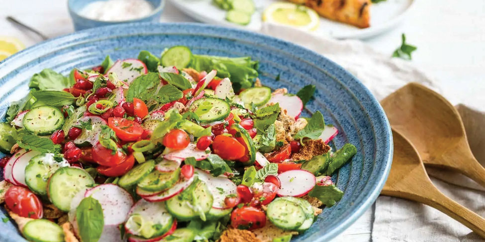 Mix tomatoes, cucumbers, radishes, scallions, lettuce, parsley, mint and pomegranate arils in a large bowl.