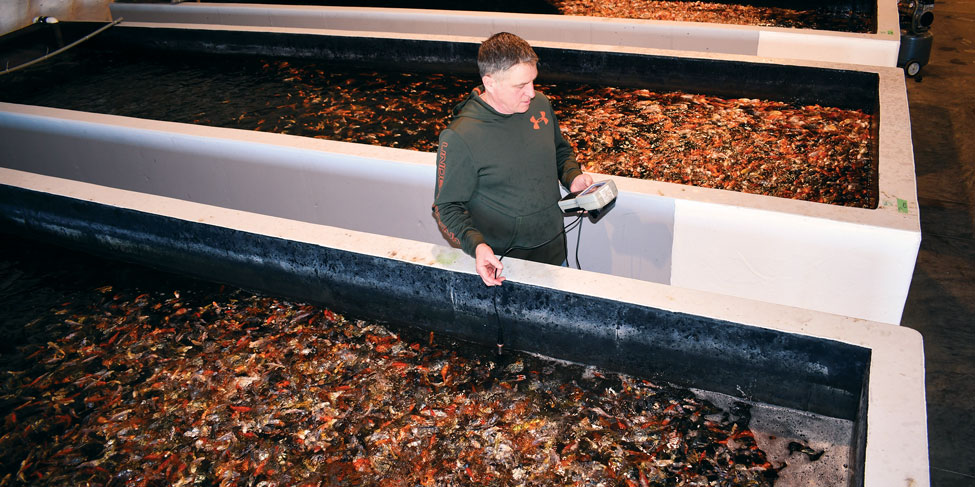 A delicate balance must be maintained for the fish to thrive. Water chemistry is monitored constantly. Oxygen levels, filtration and stocking density must remain precise to protect fish health.