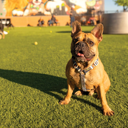 Nestled at the heart of Paws & Pints, guests will find “Your Best Friend’s Bar” and dog park – the perfect place to try flavorful eats and enjoy nearly 25,000 square feet of indoor and outdoor space sporting durable, artificial grass. Often, facilities will use recycled turf grass from old football fields and similar places, says Keith “Porkchop” Jones, who serves as the facilities manager at Paws & Pints.