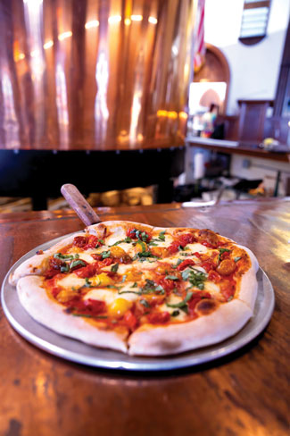 The brewery’s wood-fired pizzas are a crowd favorite, made from scratch and cooked in an oven visible from the main dining area. Downstairs, the basement serves as a private event space for up to 104 guests, with in-house catering available.