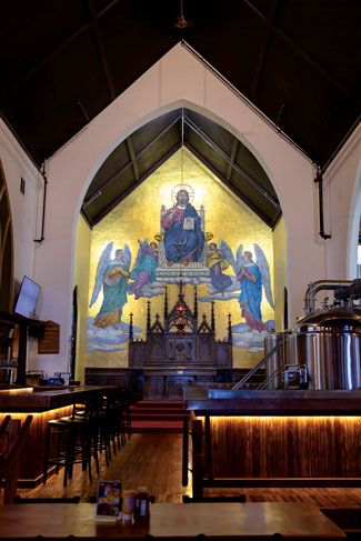 Hardwood floors were unearthed beneath layers of red carpet and plywood. Brick walls were exposed, and original materials were repurposed wherever possible. Pews turned into tables, a pipe organ became wall art and a hand-crafted 1911 mosaic of hammered gold was preserved in its original place.