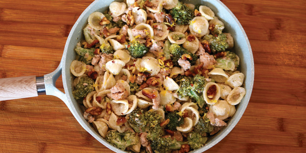 Add remaining ½ cup pasta water, cooked pasta, lemon zest, lemon juice, red pepper flakes and toasted walnuts to skillet and toss to combine.