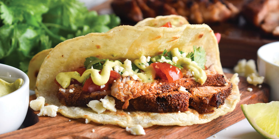Thinly slice the pork chops. Place the pork slices in tortillas and top with pico de gallo, fresh cilantro, cojita cheese and avocado salsa.