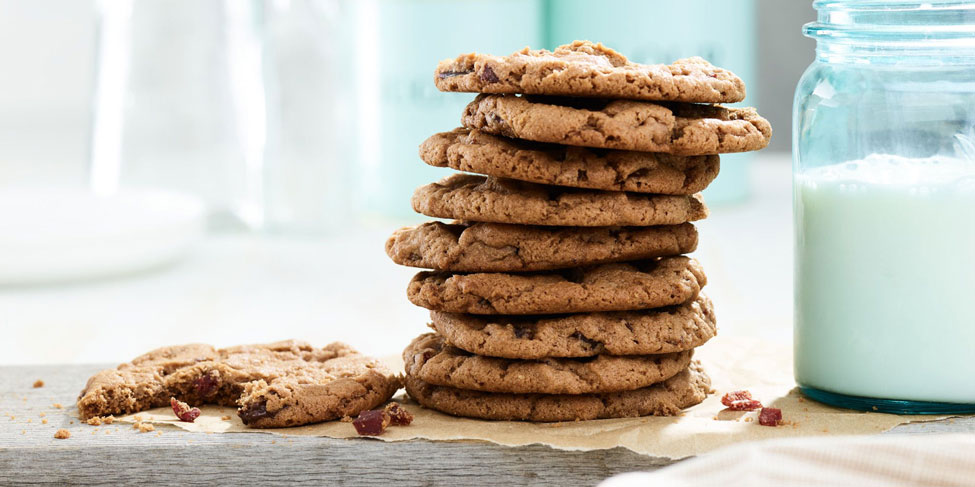 Combine flour, baking soda and salt in medium bowl; whisk together. Add flour mixture to butter mixture; mix until fully incorporated; do not over mix. Add in jerky and chocolate chips. Divide dough into 24 equal balls. Place on 2 ungreased shallow-rimmed baking sheets. Bake in 350 degrees F oven 13 to 15 minutes or until tops are evenly cracked. Cool 10 minutes before serving.