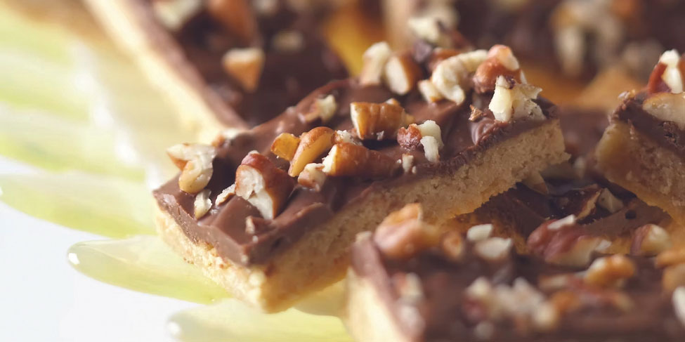 Let cool for about 5 minutes. Spread with melted chocolate. Sprinkle with chopped nuts. Cool completely. Cut into bars.