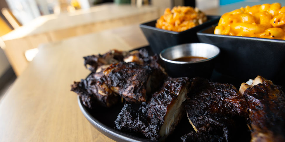 Speaking of flavors, smokey and spicy Jerk Chicken is Chef Amara’s signature dish: Juicy chicken hindquarters are dry-rubbed with Jamaican herbs and spices, marinated for 48 hours, then slowly smoked and finished over an open flame. Another popular menu item is the Braised Oxtail, which is slowly stewed in a silky sauce infused with Jamaican spice until it’s rich and tender. For fresh seafood fare, the Suya Pepper Shrimp is pan-seared and tossed in a creamy pepper sauce made with a West African spice blend and ground peanuts.