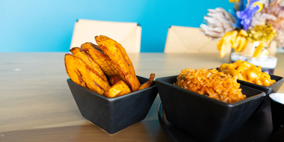 “We get a lot of our spices and seasonings from Africa or Jamaica, and that’s what we use to build our flavor profiles,” says Gerald. “Then we try to incorporate as many local ingredients as possible. We use Nadia’s French Bakery for our buns, Magoo’s Pizza crust for our pizzas, McFarland Farms for our microgreens — even the glass straws we use for drinks are made locally.”