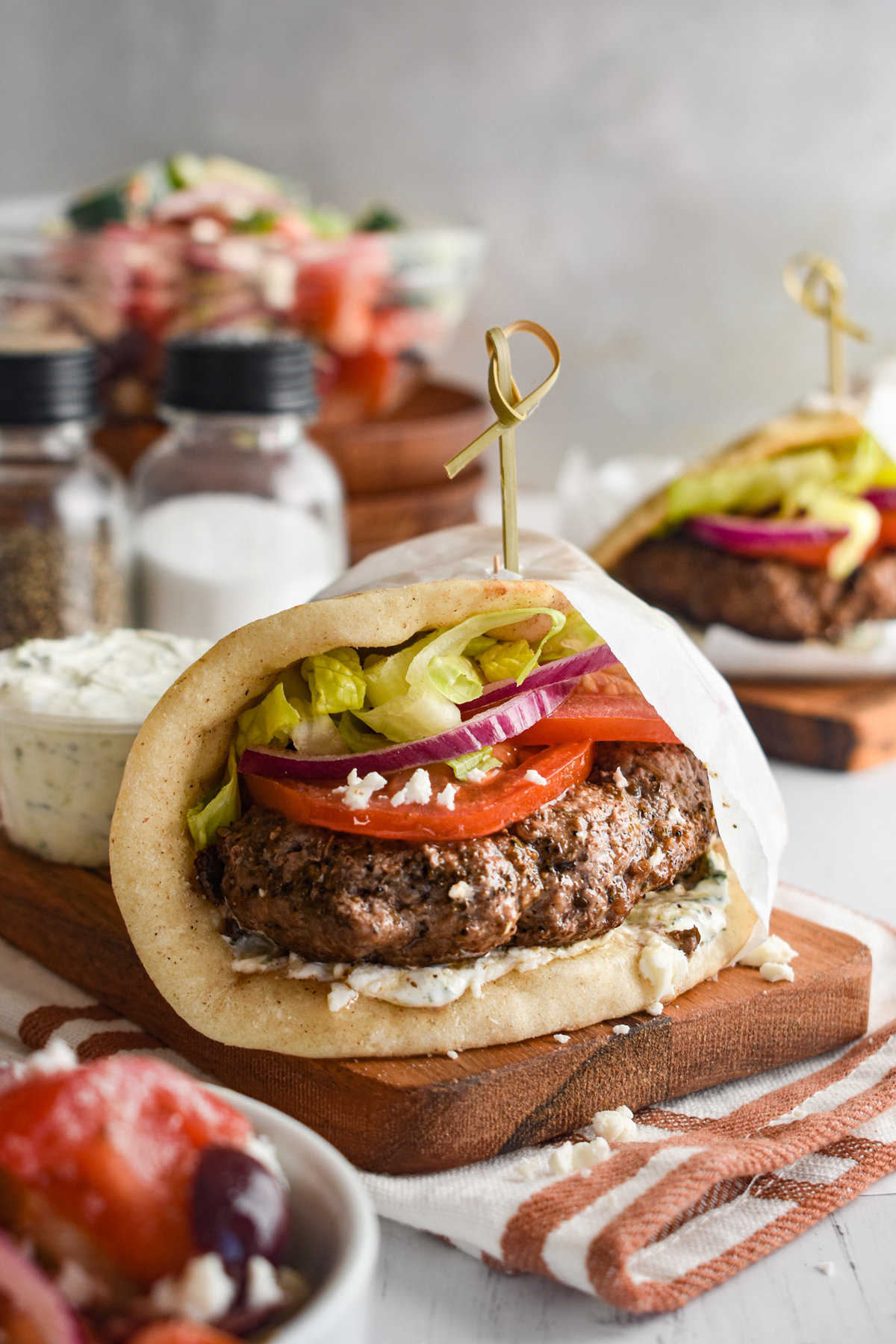 Shape ground meat into half-moon shapes the size of pita flatbread folded in half. Combine Greek seasoning and oregano flakes. Sprinkle evenly over all burgers.